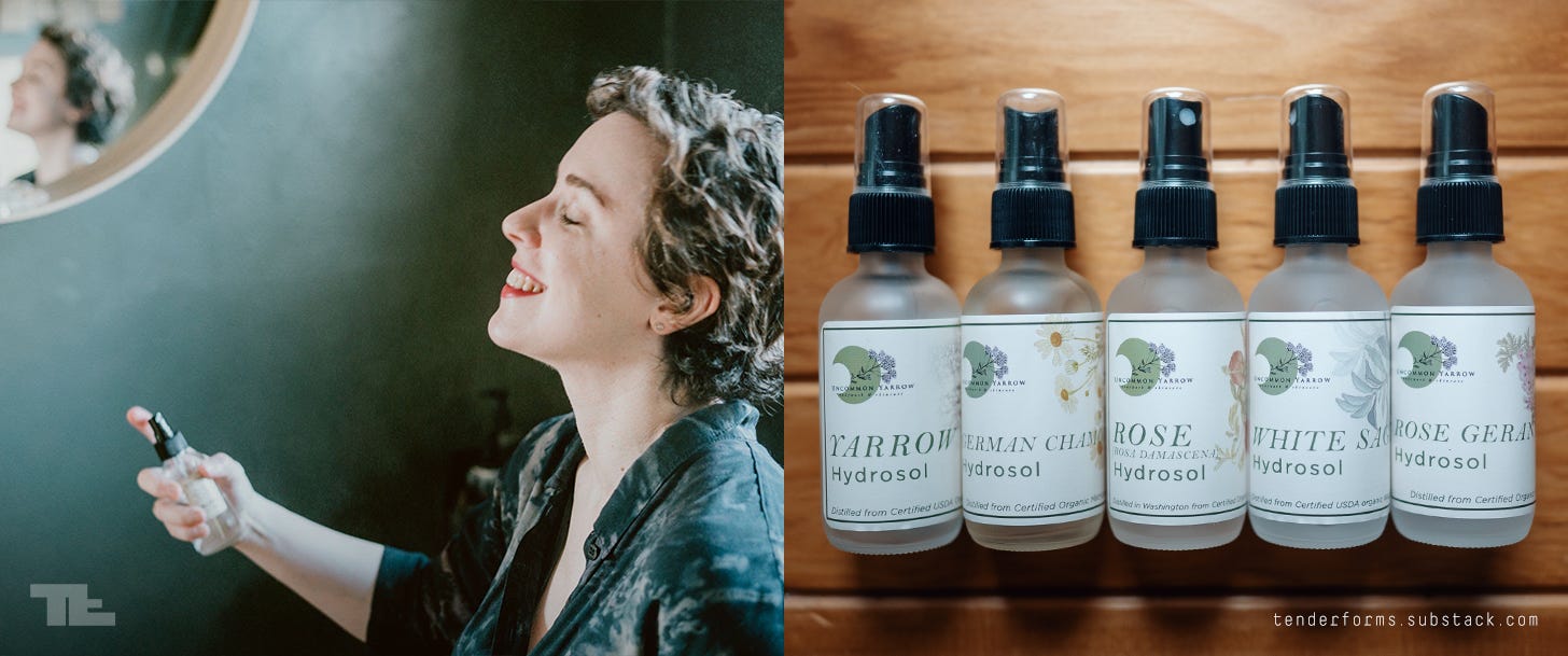 Having visited Rebecca during COVID, I only had photos of her with her mask on. Still, I wanted you to see her lovely face! Here she is captured in a moment of hydrosol joy by Cait Pearson. And speaking of hydrosols…